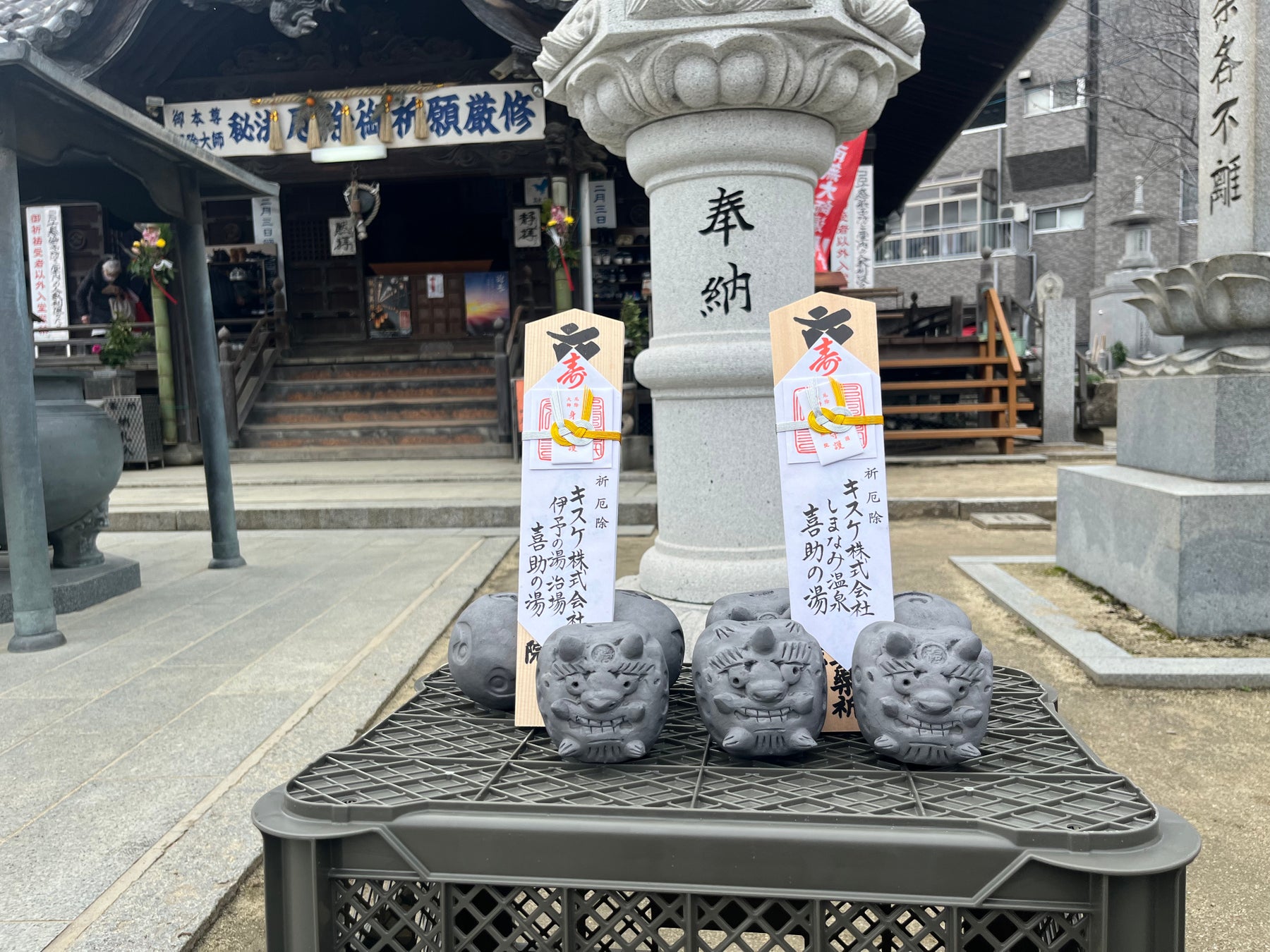 喜助の湯では、製造したサウナストーン「鬼丸」「鬼玉」の厄除け祈祷のため、愛媛県今治市菊間町に所在する寺院「やくよけ大師 遍照院」のご協力を得ました。遍照院は、四国八十八箇所番外札所、新四国曼荼羅霊場第42番札所として知られ、厄除大師の別名で親しまれています。弘法大師が42歳の時、自らの厄除けと末代緒人の厄除けのために開いたとされる遍照院は、毎年2月の「節分会厄除大祭」には、大勢の善男善女が、厄除祈願、諸願成就のために参詣します。