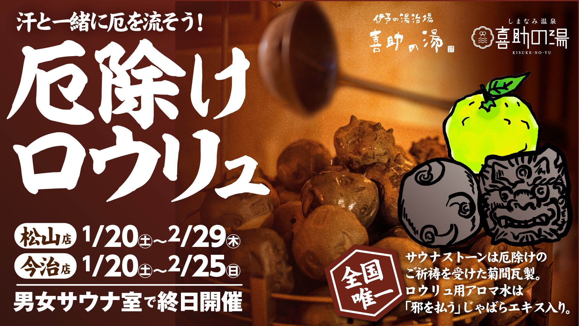 2024年1月20日(土)~2月29日(木)に、「伊予の湯治場 喜助の湯」(松山市)と「しまなみ温泉 喜助の湯」(今治市)にて、厄除けロウリュイベントが開催されます!