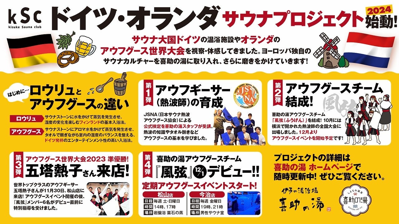 2024年には、さらなる施設の進化とサウナ文化の発展を目指し、ドイツ・オランダプロジェクトを実施。ドイツやオランダのサウナ施設を巡り、最先端のアウフグース技術や空間演出、利用者体験を学びました。その成果として、本場のアウフグース技術を取り入れた「風弦(Fūgen)」チームの結成や、施設内の環境整備の改善、さらには新しいサウナイベントの導入など、多くの進化を遂げました。