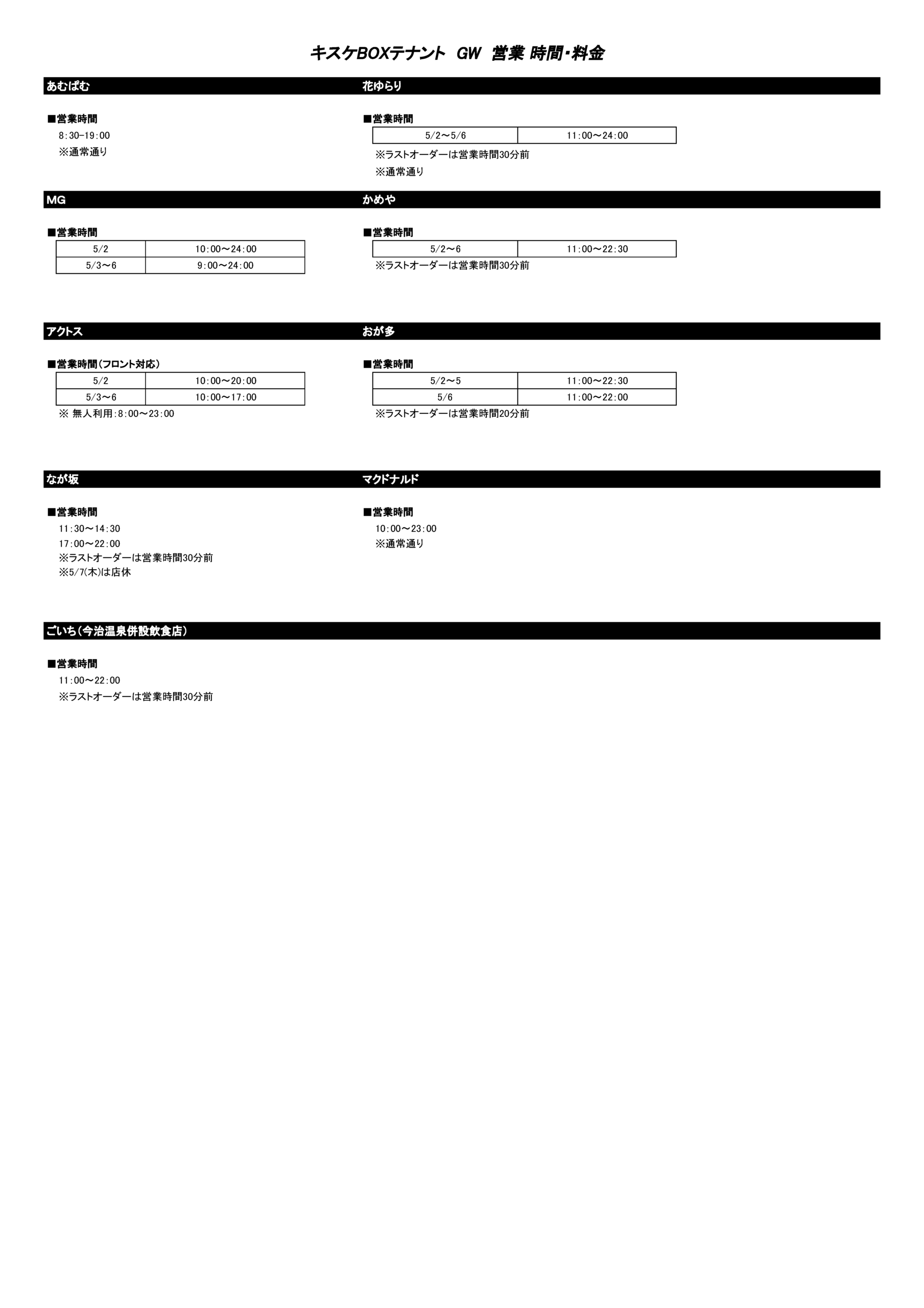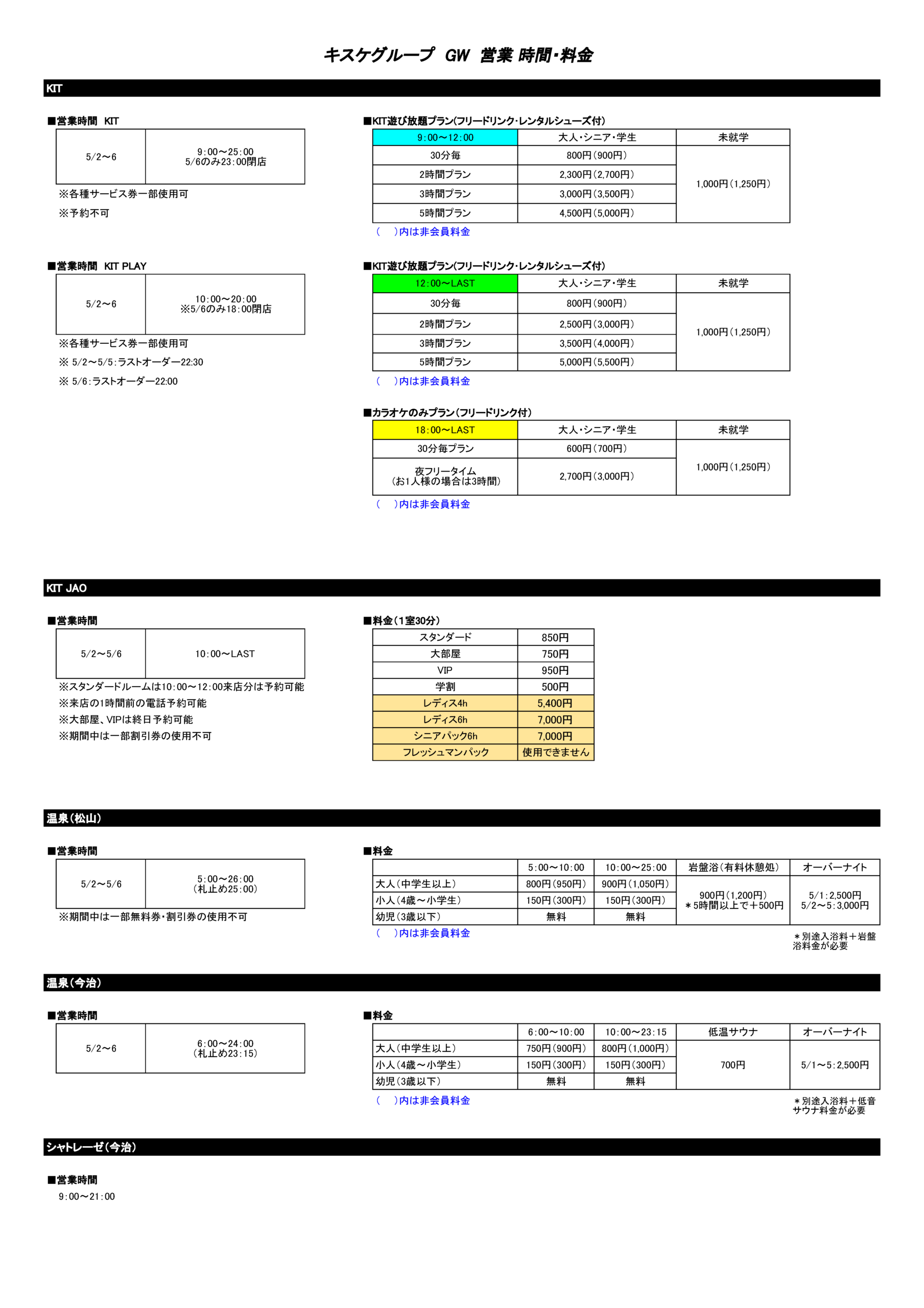 2026年5月2日~6日の間はゴールデンウィーク特別営業期間となり、営業内容や料金など一部変更がございます。