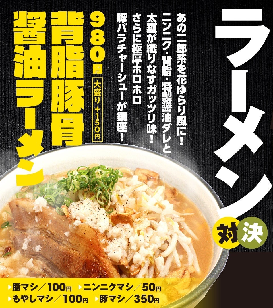 特製の醤油ダレにたっぷりの背脂を加えた、濃厚で力強い味わい。 柔らかく煮込まれた豚バラチャーシューがトッピングされ、深いコクとボリューム感が堪能できるラーメンです。追加でさらに自分好みにアレンジ可能です。