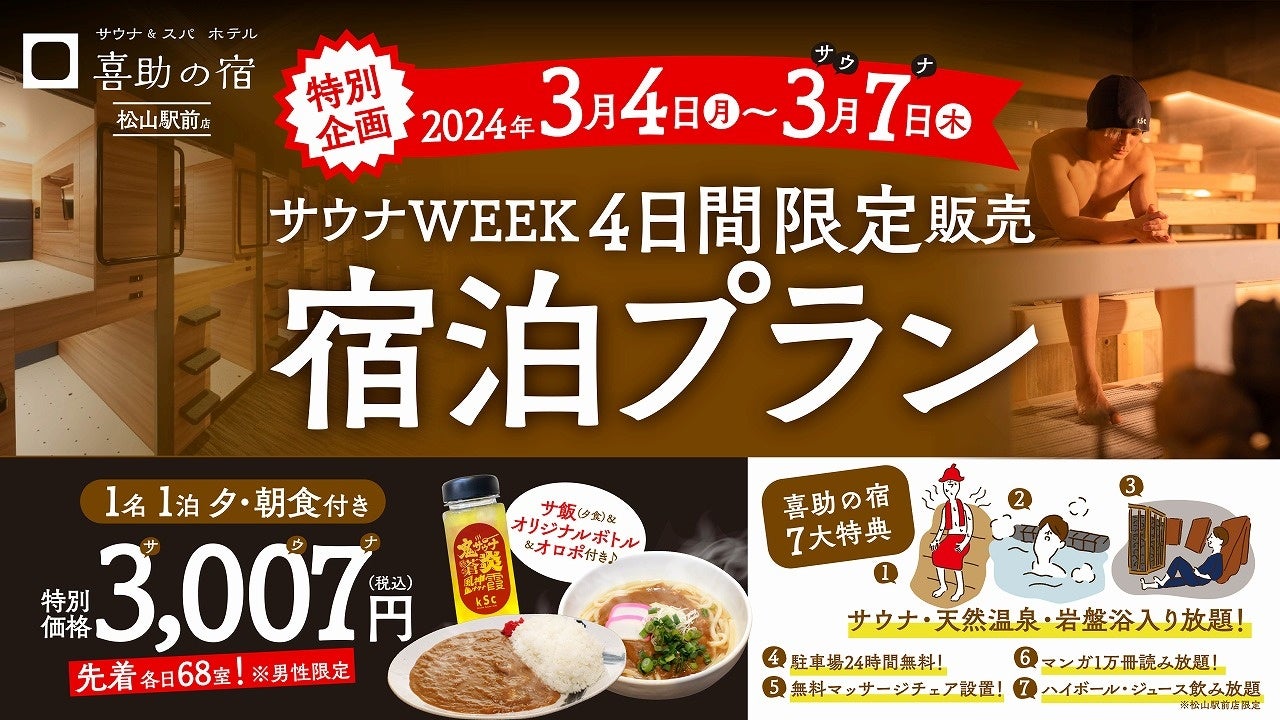 サウナ愛好家の皆様、大注目のイベント「サウナWEEK」がいよいよ3月4日~3月7日までの4日間限定で開催されます。この期間中、特別にご用意した限定プランをお楽しみいただけます。